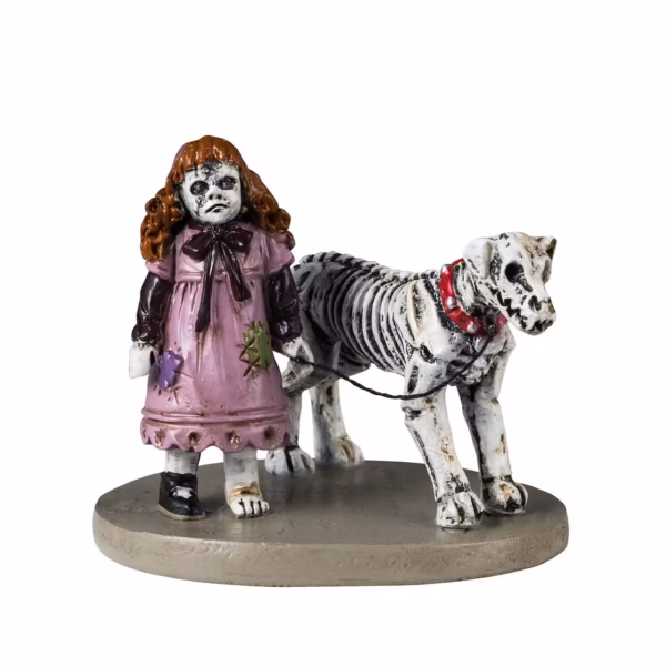Description: In the shadowy depths of twilight, a ghastly doll cloaked in morbid attire drifts along, accompanied by a skeletal hound with hollow eyes. Their silent parade echoes with sinister whispers, weaving a tale of darkness and dread in the quiet gloom.